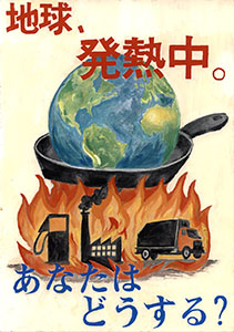 優秀賞の1つ「地球、発熱中。あなたはどうする?」は、フライパンで熱せられる地球を描いています。青い地球がフライパンに入れられ、下から炎で熱せられているという描写そのものは、他の応募作品にもありました。地球温暖化の状況を比喩的に表現したものです。特にこの作品は、2つの「かげ」(影、陰)を効果的に使っています。1つ目の「かげ」(影)は、地球の立体感を表現するものです。もう1つの「陰」は、ガソリンスタンドと工場、トラックに用いられている黒いシルエットの表現です。現代社会の便利さの裏側にある環境負荷が表現されています。