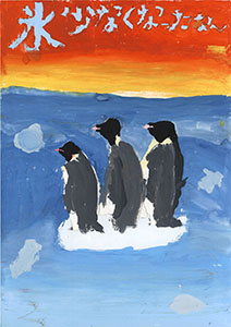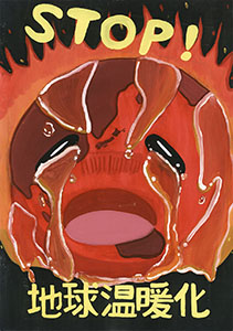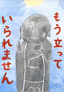 優秀賞の1つ「もう立っていられません」は、ユニークな作品です。地球温暖化といえば、太陽、あるいはホッキョクグマやペンギンなど、遠くの星や遠い外国の生き物がよく描かれますが、身近な題材であるお地蔵さんをテーマにした作品は珍しい。お地蔵さんは擬人化されており、辛そうな様子が表現されています。灰色をベタ塗りせず、お地蔵さんの石の質感を捉えている点も良いです。特に良い点は、太陽の表現です。太陽の色といえば、赤やオレンジ色がよく使われますが、ここでは白っぽい黄色が使われています。また、太陽には輪郭線がありません。このため、「直射日光」ともいえる太陽の光がリアルに描かれていると感じました。