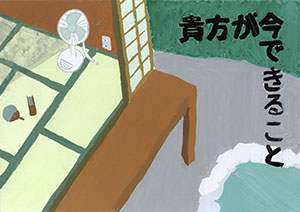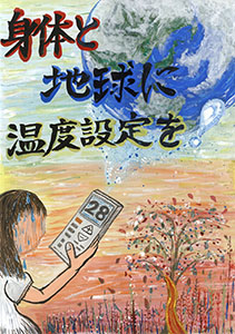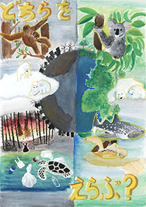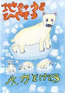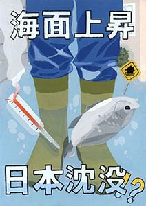 最優秀賞の「海面上昇 日本沈没!?」は、強い言葉を使ったキャッチコピーですが、疑問符「!?」があることで、これは見る者への問いかけだとわかります。「本当にそうなるのか、この未来を変えられるのではないか」という希望が込められていると解釈できます。全体的に青色が多用されており、水没(浸水害)のイメージを強調しつつ、温度計の赤や標識の黄色が、注意喚起の役割を果たしています。配色や色の塗り方は、とても丁寧です。