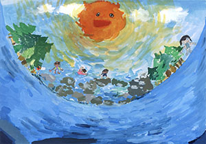 2つ目の優秀賞は、魚眼レンズを通して見たような構図で海を描いています。魚の視点から太陽や子供たちの遊び場を見ているとも解釈できるかもしれません。海と空は、ともに青色ですが、海と空で青色の濃さ・薄さを変化させることで、その境界線が滑らかによく描けています。太陽と海と空という、よくあるテーマながらも、ユニークな視点から、海で遊ぶ子供たちの様子を丁寧に描いており、きらりと光る個性のある作品です。