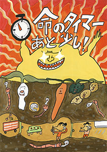 最優秀賞は、上半分に燃え盛るような太陽と空、下半分に地中で苦しむ「命」が描かれています。「命のタイマーあと少し!」というキャッチコピーと、残り時間の少ない時計のイラストは、「手遅れになる前に行動が必要だ」というメッセージを明確に伝えています。特に良い点は、色の使い方です。赤やオレンジ色の背景は、地球温暖化に伴う「熱」や「異常気象」を想像させます。一方、苦しむ野菜の葉の色は、野菜ごとに異なる緑色が使われています。単に危機感をあおるだけでなく、自然に対する細やかな眼差しが感じられます。