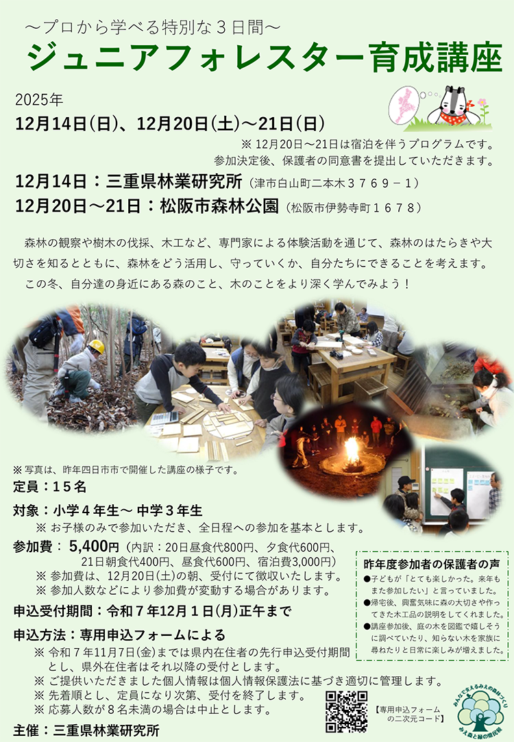 三重県「令和7年度ジュニアフォレスター育成講座を開催します」https://www.pref.mie.lg.jp/RINGI/HP/m0135700281.htm