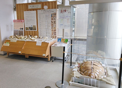 伊勢湾では、春から夏にかけてウミガメがやって来て、産卵します。親や子ガメにとっての砂中温度の適温は30℃未満といわれていますが、2024年は記録的な猛暑でした。死亡漂着したカメの甲羅や多くの頭蓋骨を展示しました。また、ウミガメの産卵にとって危険なゴミである、海岸に捨てられていた釣り道具の針のついたルアーや注射器なども展示し、ごみをポイ捨てしないよう呼びかけています。これらのウミガメをどうしたら助けることができるか、少しでも多くの方に考えてもらえる機会となったことを願います。