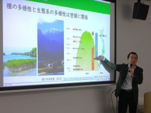 講義では、生物多様性が「種」「生態系」「遺伝子」の3つのレベルから成り立つこと、さらに地域内の多様性(α多様性)だけでなく、地域間の違い(β多様性)を考えることの重要性を示されました。外来種が侵入すると、一見その地域の種数は減らないように見えても、地域ごとの違いが失われ、結果として生物多様性が低下してしまいます。