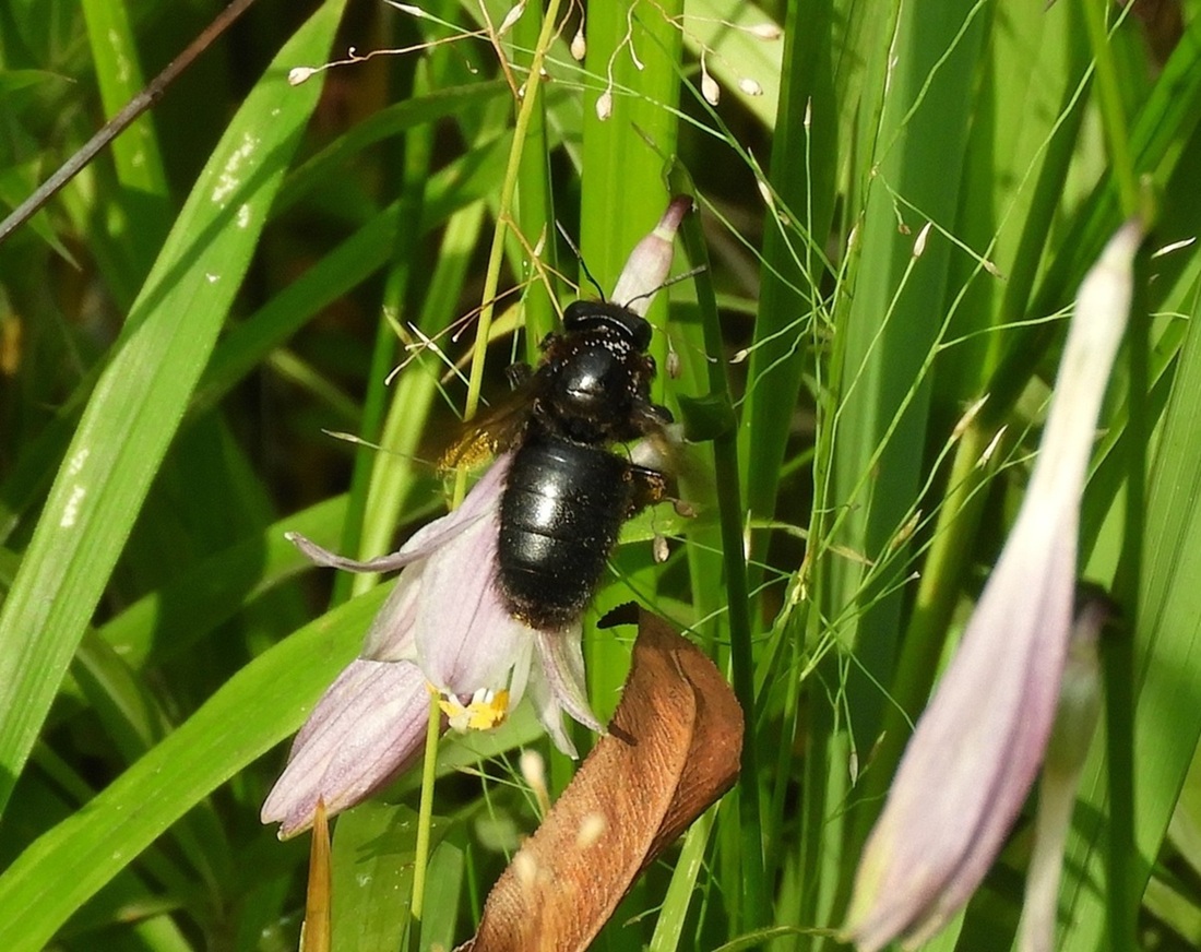 その花を見ていたら、タイワンタケクマバチが飛んできて、ミズギボウシの花にとまりました。