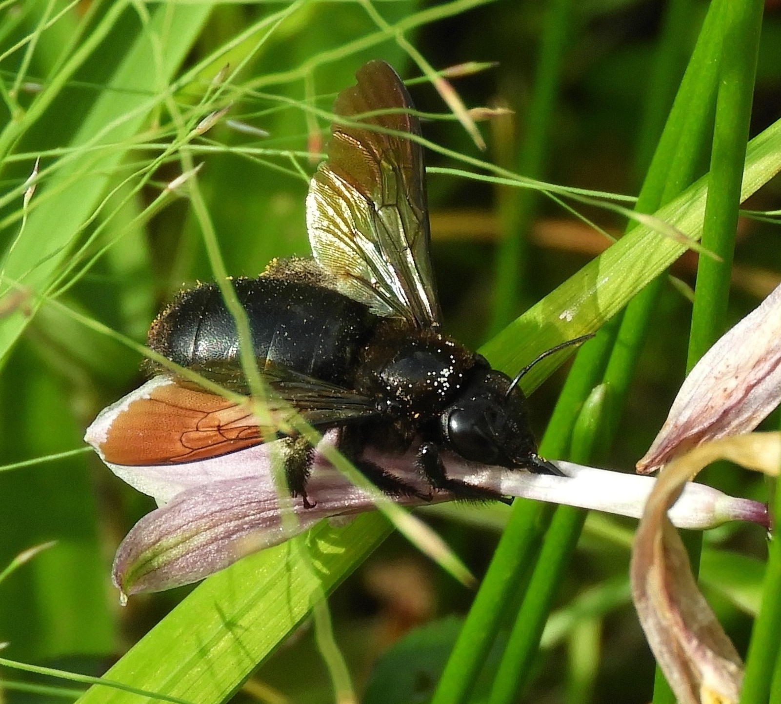 そう言えば… キムネクマバチ(クマバチ)は筒状の花の根元の近くに外から口吻を突き刺して、蜜を吸うことを思い出しました。このような行動は、花にとっては花粉を運んでもらえないので、「盗蜜」と呼ばれています。口吻が蜜まで届かないキムネクマバチにとっては、生きるための術なのでしょうけれど。