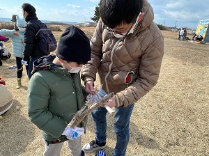 ウミガメ保存会主催の吉崎海岸清掃の後、行われる環境勉強会に「流木工作」の出前講座に行きました。