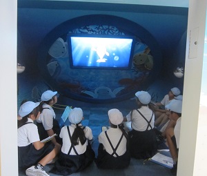 展示ホールクイズの答えを探している間に、交代で「伊勢湾への忘れもの」の中に入って海のごみについてのDVDも観てもらいました。