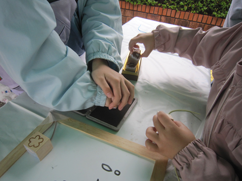 あいにくの雨の中でしたが、サイコロの形の木のオリジナルストラップを作りました。スタンプを押して、色鉛筆で色を塗ったら、完成!とても簡単なので、小さな子どもさんにも楽しんでいただけました。