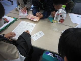 ごみを処理する為には、たくさんお金がかかります。どんなところにお金がかかるのかお話した後、みなさんにごみを処理するためにどれくらいお金がかかるのか、自分たちが買ってきた品物で計算しました。