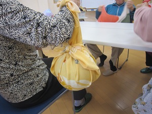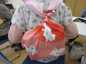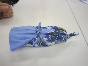今日は、ふろしきバッグを何種類かつくってみました。ふろしきを一枚カバンに入れておくとレジ袋の代わりにもなり便利です。自分で使いやすいように工夫し、ぜひ活用してください。