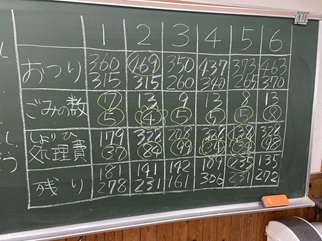 ごみを処理するためには、たくさんお金がかかります。どんなところにお金がかかるのかを考えた後、自分たちが買ってきた品物からどのぐらいのごみが出て、処理するためにはどれぐらいの費用が必要なのかを計算しました。