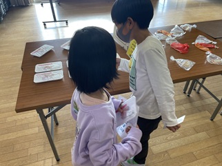 「買い物ゲーム」では、カレーを作るための材料と飲み物を、別の部屋に作った模擬スーパーマーケットでグループごとに買い物をしてきます。みなさん相談しながら、楽しく買い物ができました。そこで、買い物をすると「ごみ」がたくさん出てしまうことに気づきました。