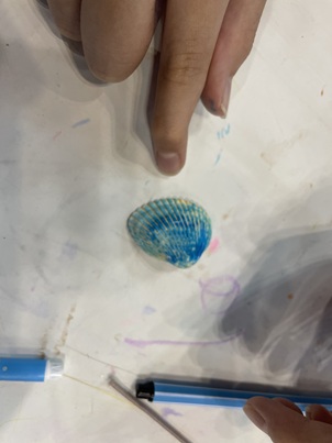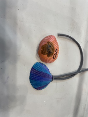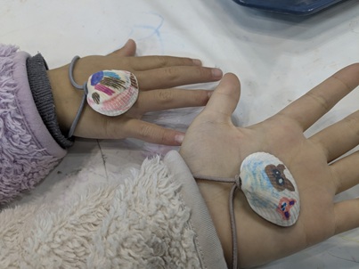 今日使用した貝は、サルボウガイです。どれも同じように見えて、ひとつひとつ大きさや形、穴の位置などの違いがあります。貝を選んでいる時に貝の名前や、穴は実は別の貝に食べられたあとであることなどをお話するとみんなびっくりしていました。