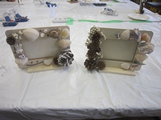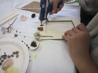 フォトフレーム作りは、三重県の海岸や里山で採った貝がらや木の実当の材料を選んでグルーガンでつけていきます。