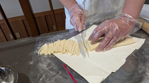麺棒で伸ばして、丁寧に切っていきます。